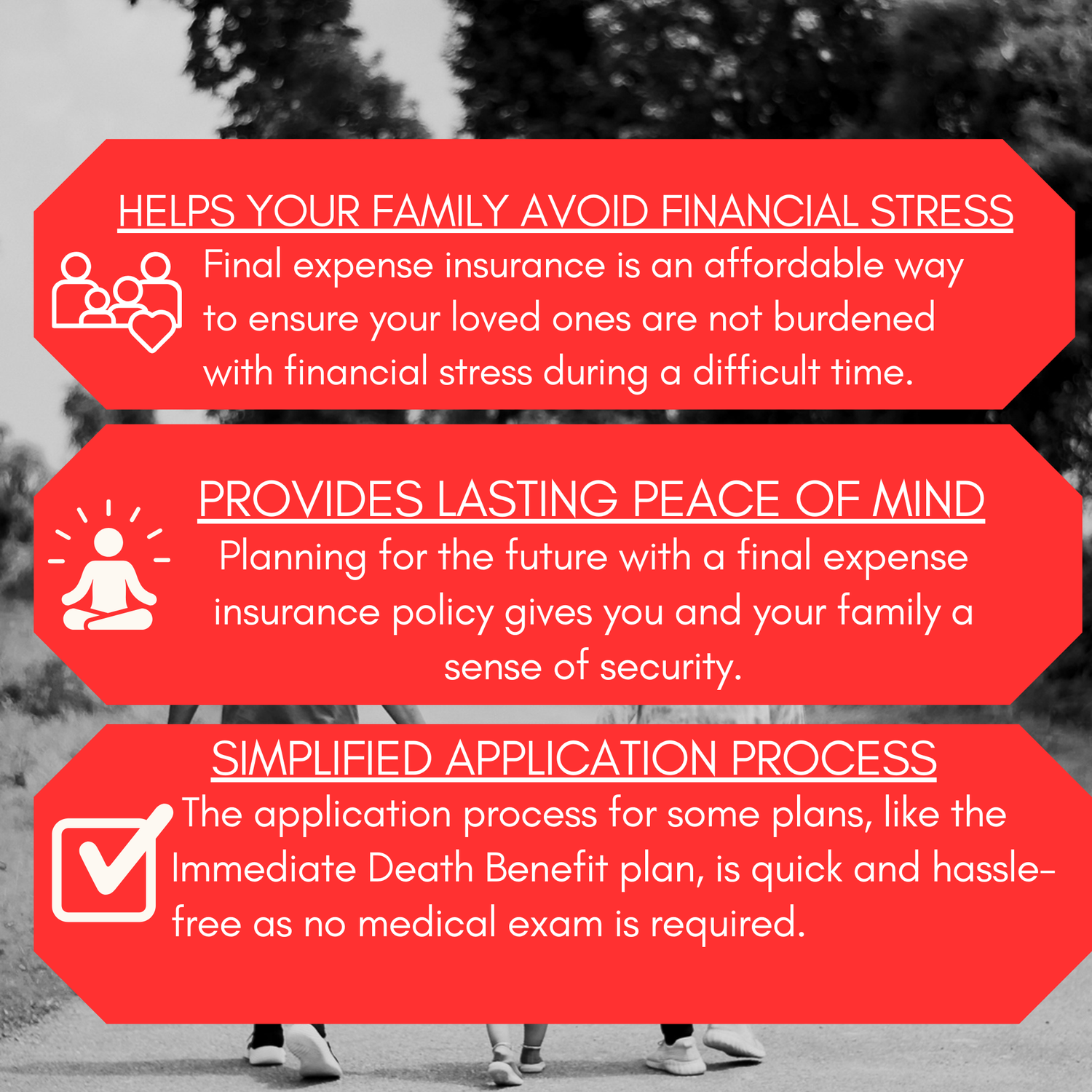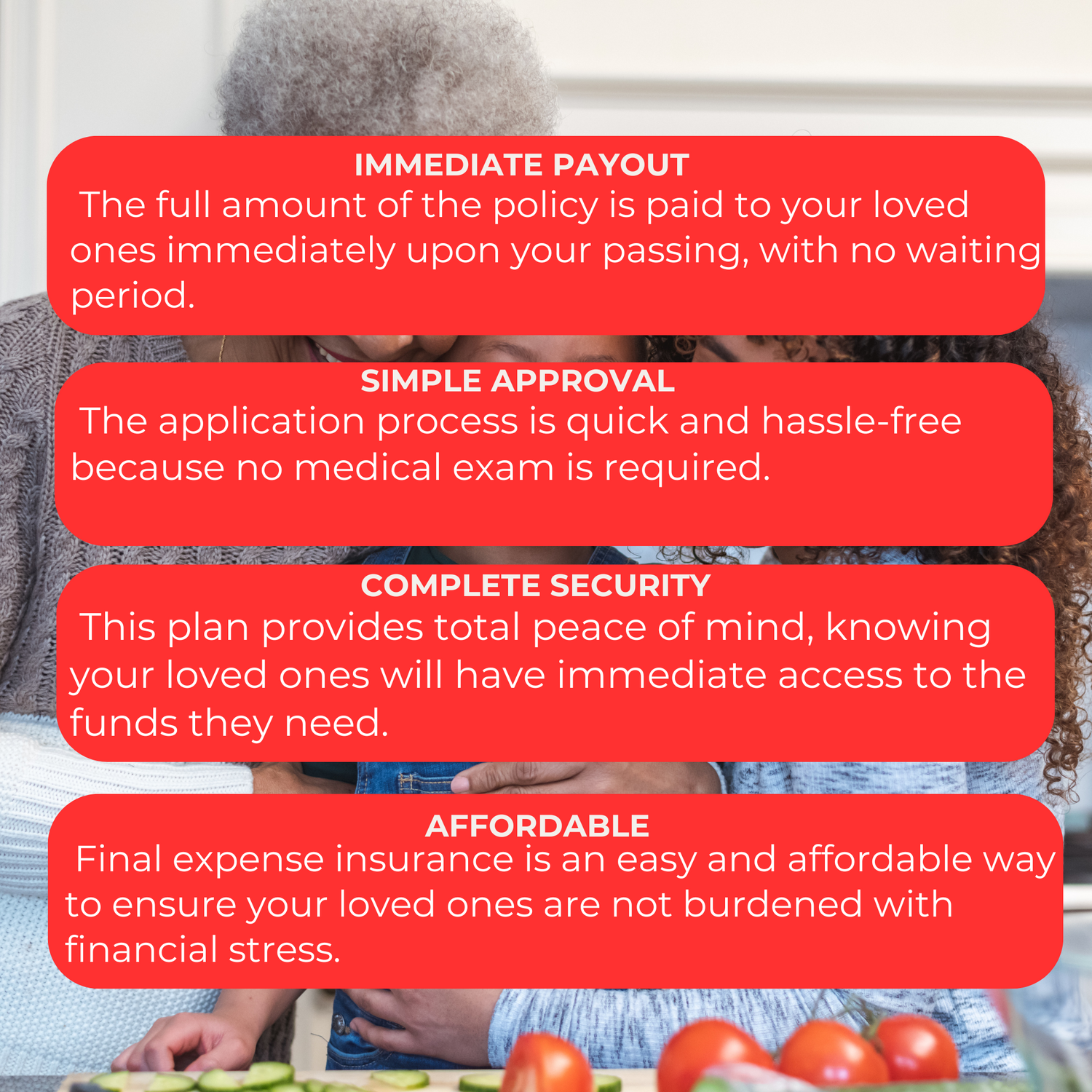 An affordable alternative to traditional life insurance that doesn't require a medical exam and provides a quick payout to your loved ones, giving you both peace of mind.